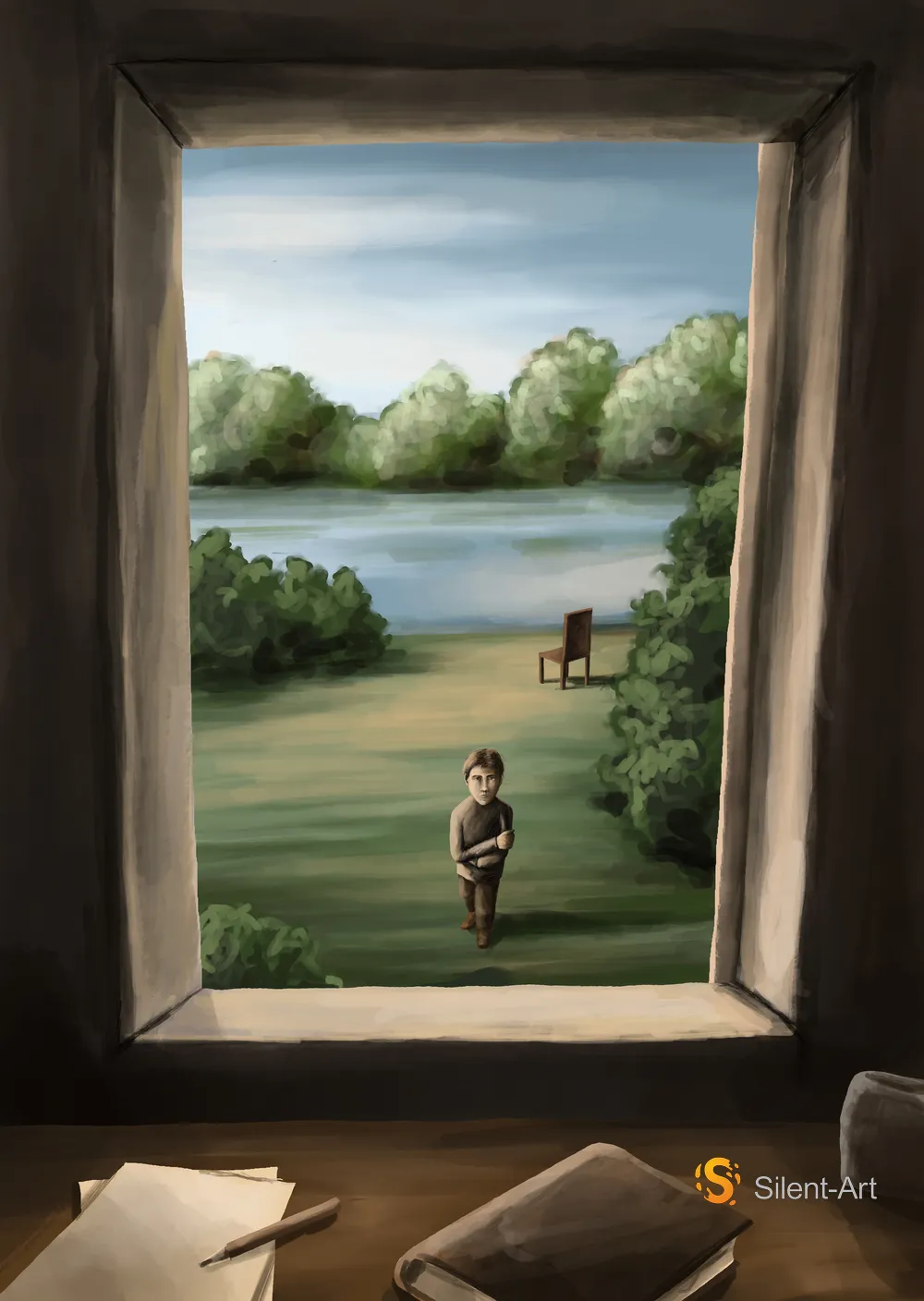 Ein Innenraum öffnet den Rahmen. Auf dem Tisch liegen Papier, Stift und Bücher. Draußen weitet sich eine Wiese zum See, ein Junge blickt herüber, ein einzelner Stuhl steht am Rand. Die stille Szene verbindet Nähe und Distanz. Von Silent-Art und Jörg Hornisch getragen von klarer Komposition und Ruhe.