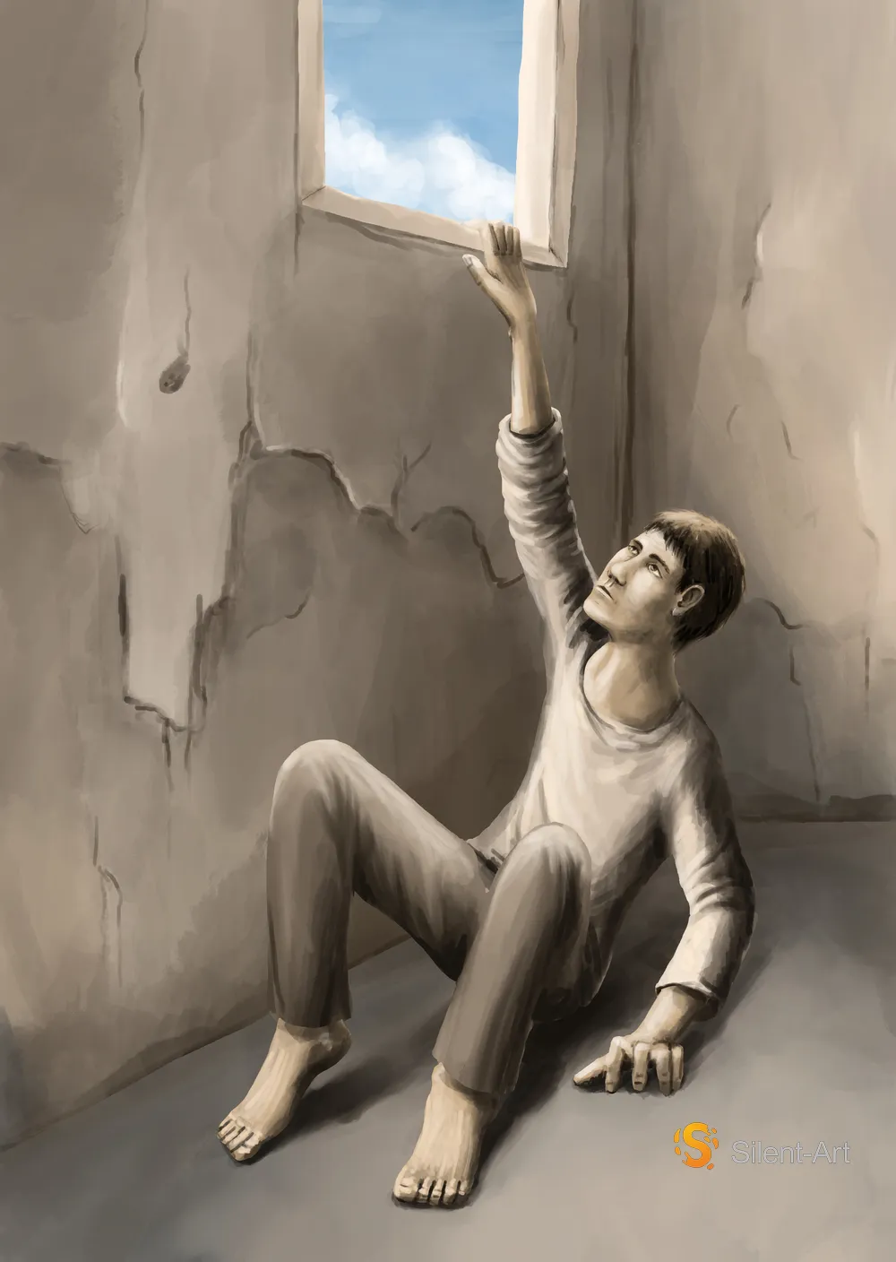 Du siehst einen barfüßigen Mann, der auf dem Boden in einer Raumecke sitzt. Er streckt einen Arm nach oben zum Fensterrahmen, hinter dem blauer Himmel und helle Wolken zu sehen sind. Die Wände wirken rissig und fleckig, Licht und Schatten liegen deutlich auf Wand und Boden.