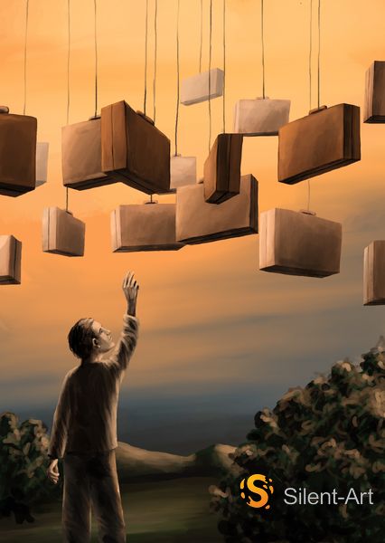 Silent-Art Gemälde 2025-01-004 – Griff nach den schwebenden Koffern