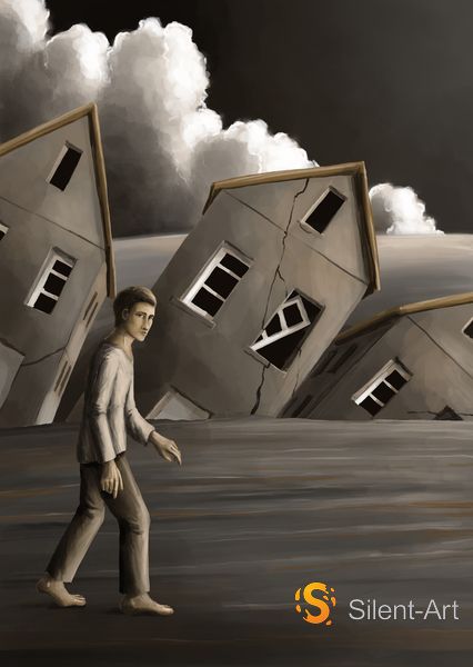 in barfüßiger Mann schreitet über eine dunkle Fläche an mehreren schief stehenden Wohnhäusern vorbei. Die grauen Fassaden der Gebäude zeigen Risse und wirken als würden sie im Boden versinken. Im Hintergrund türmen sich helle Wolken vor einem schwarzen Himmel auf während das Licht klare Kontraste auf der Kleidung und der Architektur erzeugt.