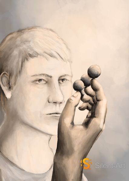 Ein helles, klar modelliertes Gesicht füllt den oberen Bildbereich und blickt konzentriert auf ein Objekt im Vordergrund. Eine dunklere Hand hält vier kugelförmige Elemente, die an einem gemeinsamen Stiel verbunden sind, in Richtung des Gesichts. Die Farbpalette bewegt sich in warmen Sepia- und Beigetönen auf einem diffus aufgehellten Hintergrund. Der Kontrast zwischen der hellen Gesichtspartie und der dunkleren Handfärbung strukturiert die Komposition in klar getrennte Bildebenen.